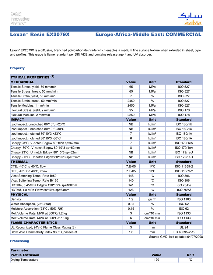 应用范围:产品描述LEXAN PC EX2079X物性表Lexan* EX2079X is a diffusive, branched polycarbonate grade which enables a medium fine surface texture when extruded in sheet, pipe and profiles. This grade is flame retardant