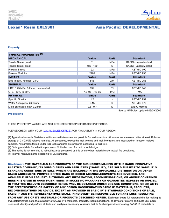 应用范围: 产品描述 LEXAN PC EXL5301物性表