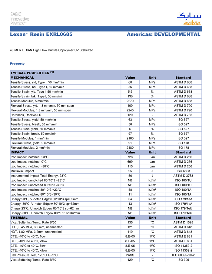 应用范围: 产品描述 LEXAN PC EXRL0685物性表 40 MFR LEXAN High Flow Ductile Copolymer UV Stabilized