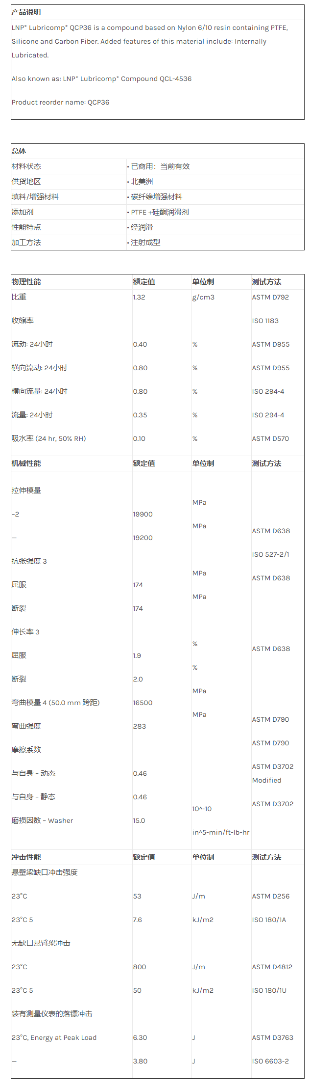 应用范围:产品描述LNP LUBRICOMP QCP36物性表